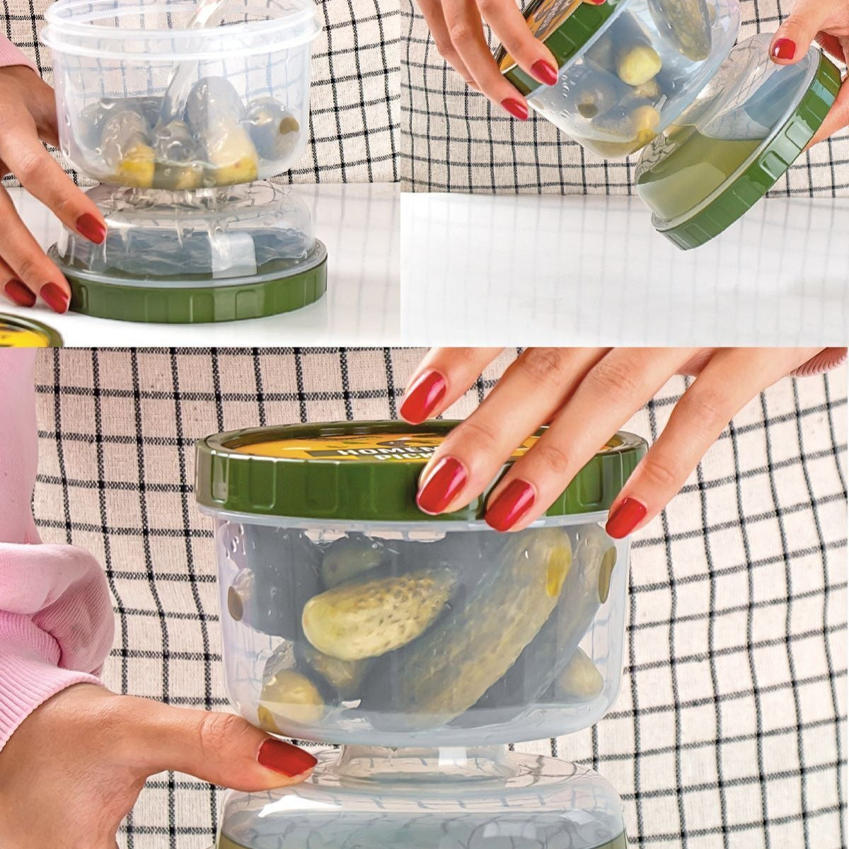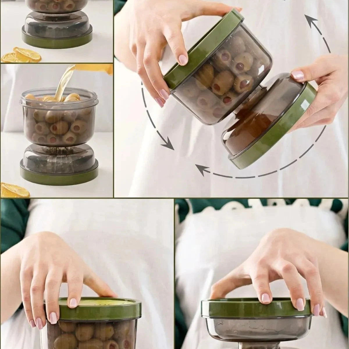 Kum Saati Zeytin & Turşu Kabı, yenilikçi süzgeç sistemiyle içindeki zeytini veya turşuyu sudan kolayca ayırır.